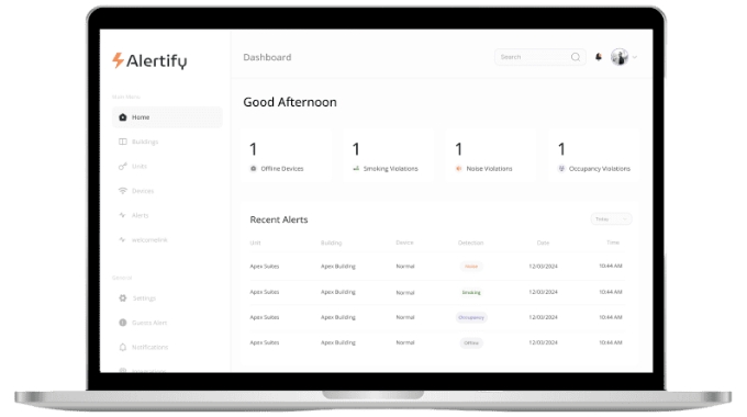 Alertifyは、騒音や喫煙を検知すると5分以内に通知を送信します。これにより、賃貸契約のルールを遵守できます。