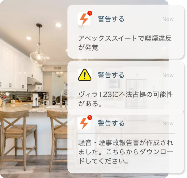 - 騒音、喫煙違反、物的損害などの詳細なレポートをダッシュボードからすぐに確認可能。