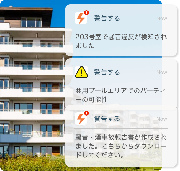 リアルタイムの騒音・喫煙アラート、180日以上保存されるトラブルレポート、そして先回りの問題管理で、ご近所との良好な関係を守ります。